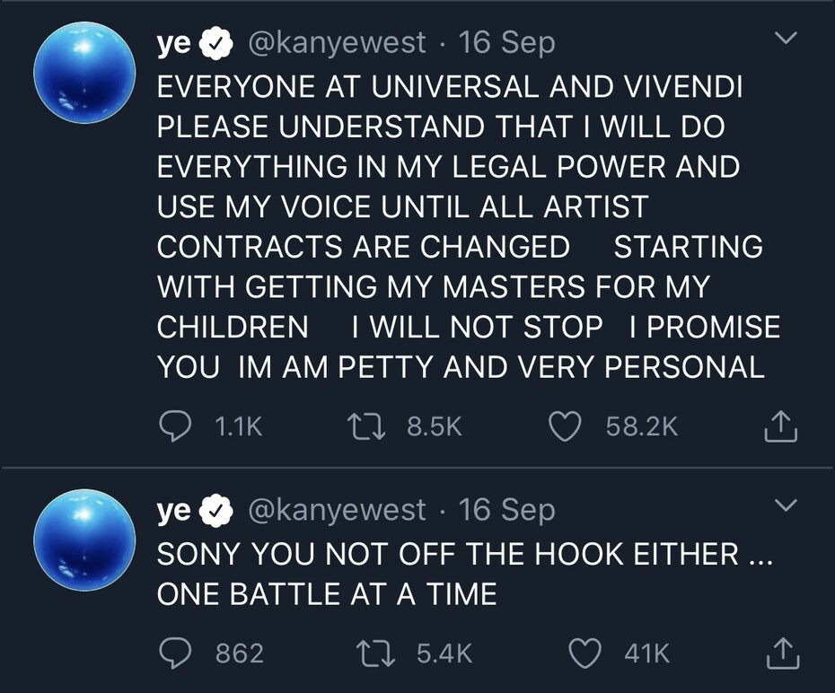 Nasdílel fotografie svých smluv s vydavatelstvími a vyzývá další hudebníky, aby se k němu přidali a pomohli mu osvobodit novou generaci muzikantů. Vydavatelství zároveň varuje, že udělá vše, co je v jeho právních silách, aby je zničil. V jednom příspěvku upozorňuje společnost Sony, že je další na řadě, se kterou má v plánu se vypořádat.