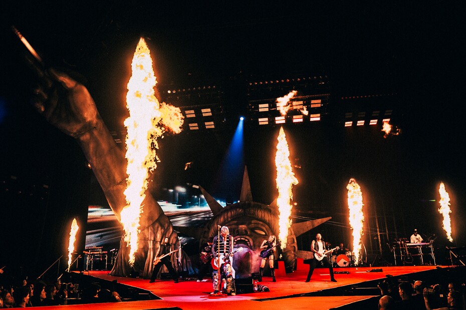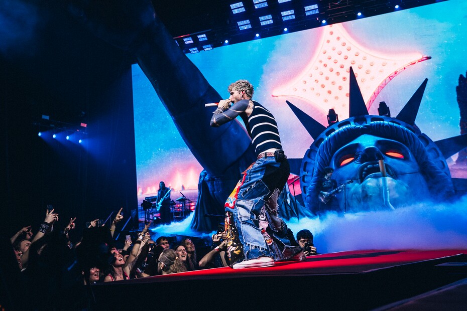Úderem deváté se rozeznělo intro se slovy „The Myth, The Legend, The Last Rock Star“, a vzápětí na pódium vtrhl Machine Gun Kelly. Vynořil se přímo z útrob obří hlavy Sochy svobody, která dominovala scéně po celý večer. Doprovázeli ho tři kytaristé, takže ve chvílích, kdy sáhl po kytaře i on sám, zněly arénou hned čtyři najednou. Americkou estetiku podtrhovaly i detaily: blána kopáku nesla vizuál připomínající ikonickou krabičku cigaret a stojan na mikrofon měl podobu obří cigarety. Ostatně právě ty patřily k jeho večerním rekvizitám — mgk si během koncertu opakovaně zapaloval další.