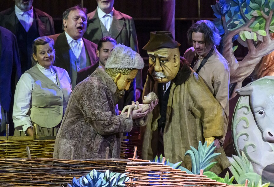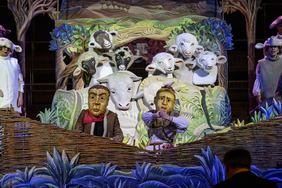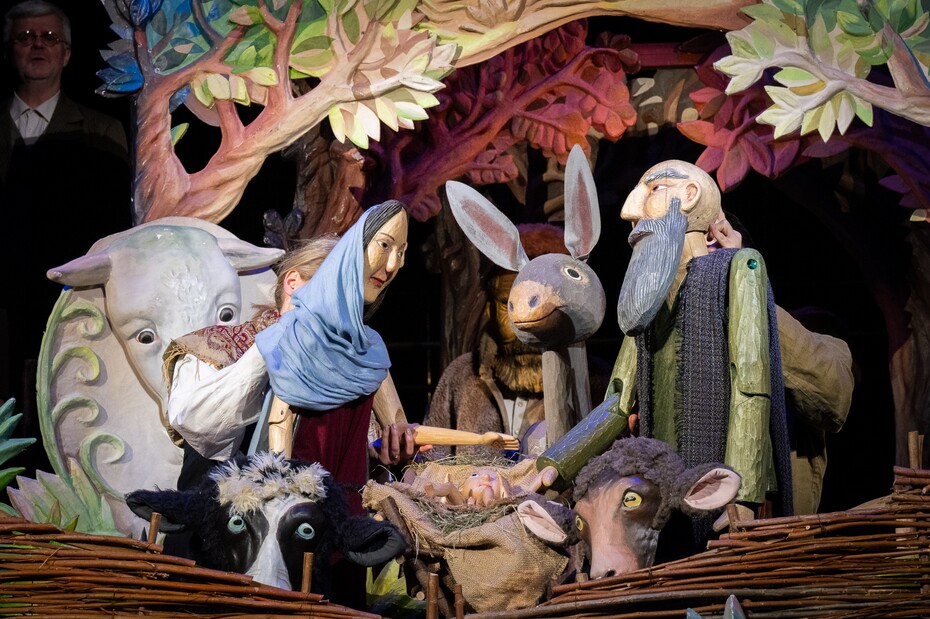 K tomu asistuje na scéně nemalé stádo téměř opravdických ovcí, postavy pastýřů, hvězdy na noční obloze a množství postav vesnických dobrých lidí, kteří se vydávají s dary na cestu za zářící hvězdou, poklonit se dítěti Ježíši a chválit Boha.