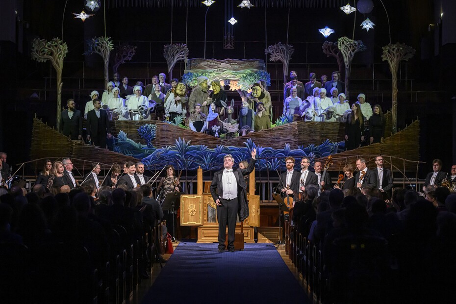 V kostele svatých Šimona a Judy je Rybovka „doma“. Vše je blízko – scéna, hudba i interpreti jsou tu na dosah. Přijít až k jesličkám je jednodušší. Ve Smetanově síni si tahle mírná indispozice velkého prostoru sama našla dojemné řešení. Po skončení Rybovky necháváme znít varhany nebo pozitiv jako v kostele po mši a diváci spontánně přicházejí blíž ke scéně. Mohou projít kolem jesliček, které po poslední scéně a tónech hudby zůstávají přístupné. Je to jako pouť k jesličkám, kterou občas ve vánočních časech zažijete v kostelích. A smysl Vánoc je tu.
