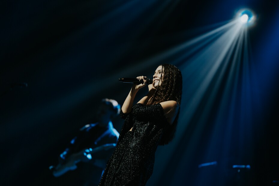 V druhé půlce se sestava, už zpátky na hlavní scéně, rozšířila ještě o tříčlennou dechovou sekci a vokalistky, zatímco Tichá zůstala sama na ostrůvku. V tomto bodě chvilku trvalo, než si sednul zvuk, zpočátku se totiž hlavní vokální linka mezi novými nástroji a hlasy trošku ztrácela. Pak už se zpěvačka vrátila zpátky ke kapele, tentokrát za plného světla a přímo skrz publikum vyprodané haly. V základním setu nechyběly skladby jako ohnivé Pravé poledne, hitový Plamen, Ta třetí se skvělým trumpetovým motivem nebo Divoká, kde bylo divoké hlavně prodloužené Matoušovo kytarové sólo a ještě divočejší Marovy taneční kreace. V několika písních se ke kapele připojil i její častý host akordeonista Michal Mihok, víc speciálních hostů si ale Tichá nezvala, i když repertoár společných skladeb by na to měla (namátkou Cais, Kozub, Vesna). A je to jen dobře, takhle její první velký koncert nebyl roztříštěn uváděním rozličných cizích elementů, ale držel si fokus na Kateřině, jejích vynikajících vokálech a výborných instrumentalistech z Bandjeez.