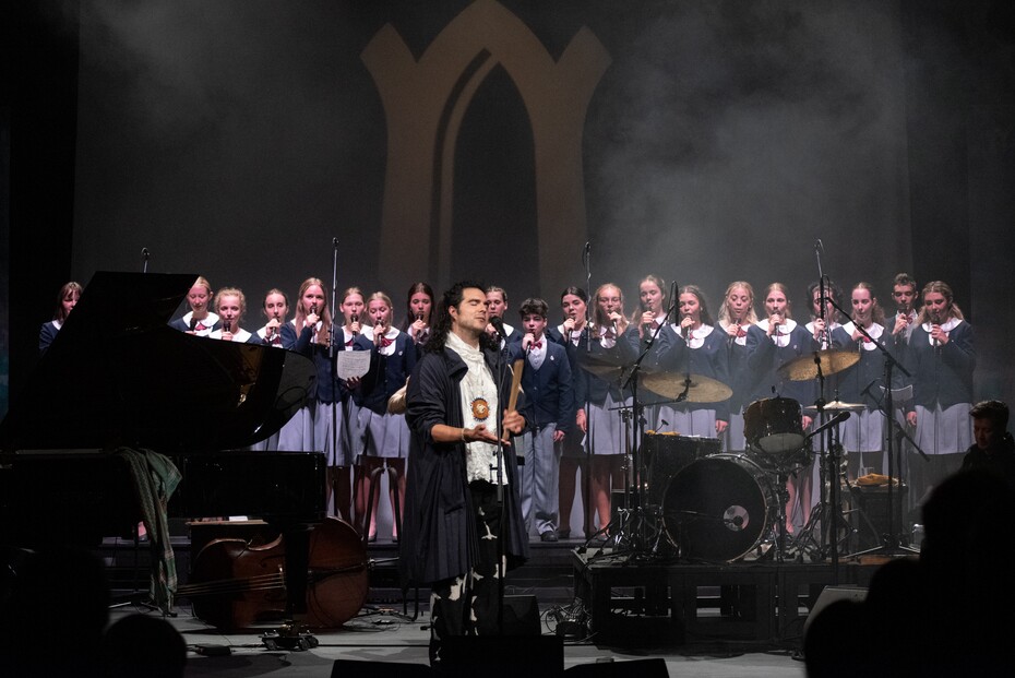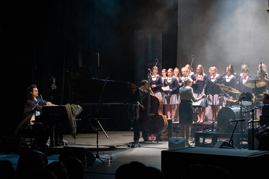 Pokud se zeptáte sbormistryně Silvie Langrové, nejspíš vám řekne, že jde o harmonicky a rytmicky složité kompozice a když prý vzala do rukou noty ke skladbě Sakom, měla obavy, že je dívky nezazpívají. Má pravdu, Dutcherova hudba není na první dobrou, oplývá však darem vás jak na albu, tak na koncertu postupně, zato intenzivně vtáhnout do svých sítí se zpěvákovým hlasem, ve kterém se střídají klasické, popové, ale i indiánské polohy a hrou na klavír. Zážitek bylo poslouchat, jak si s původními rozmáchlými aranžemi poradila kapela. Copak rytmika – bubeník Stef Schneuder a kontrabasista Bram Gielen – to se dalo čekat, kdežto kytaristu a hráče na lap steelku Christine Bougieho a jazzovou trumpetistku Taru Kannangara jste ocenili teprve po chvíli, abyste se pak nemohli dočkat, až Jeremy Dutchera znovu nádherně podbarví. Tara k tomu procítěně zpívala a možná si ji pamatujete z nahrávek kolumbijské zpěvačky Lido Pimienta.