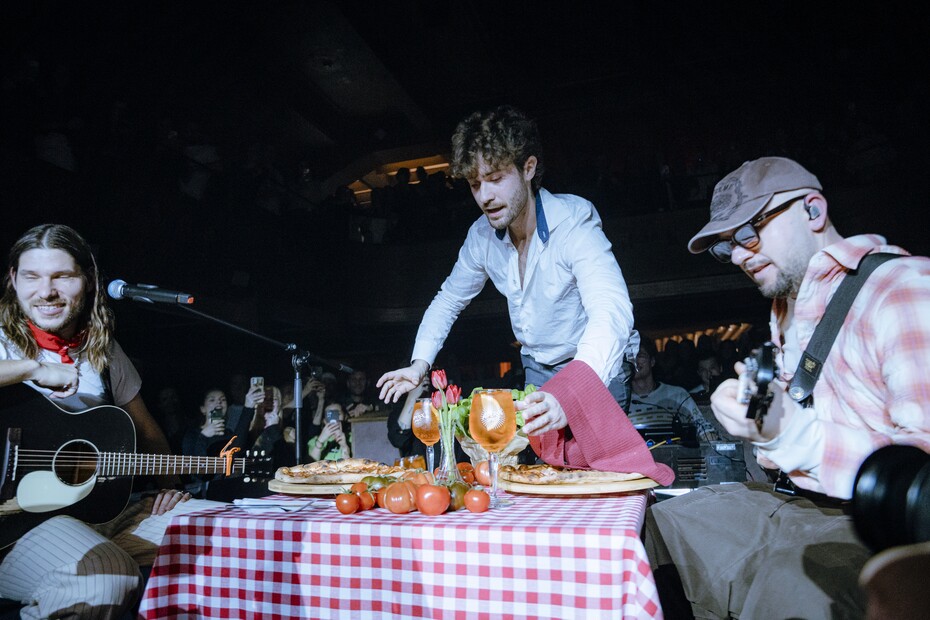 Hrálo se z obou vydaných alb dvojice a ještě z Marcellovy sólovky Hovory domů. Z nového alba Pizza pivo zaznělo snad úplně vše. Na pódiu se vystřídalo i hodně hostů, dorazil třeba Ben Cristovao, kterému Marcell s fiedlerskim předskakovali na nedávných koncertech. S Marcellem si Ben zazpíval jejich společnou píseň Nevim a pokračoval songem, který dělal zase s fiedlerskim. Zazpívat přišel i Paulie Garand, Mat 213 a The Curly Simon, až z Itálie přiletěl Carmine Tundo, který albu o pohodovém životě s pizzou a pivem na chatě v Itálii dodává punc autenticity v titulní skladbě. Právě během ní se původně jednoduchá scéna proměnila, když spadnul rudý závěs a odhalil v pozadí pódia celou stěnu postavenou z krabic od pizzy.