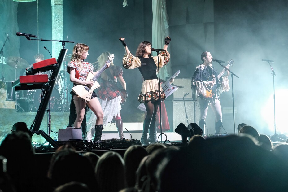 Poté již na pódium nastoupily Abigail Morris (hlavní zpěv), Georgia Davies (basa), Lizzie Mayland (kytara), Emily Roberts (kytara) a multiinstrumentalistka Aurora Nishevci (klávesy) doprovázené bubeníkem Casperem Milesem. Mimochodem pódium bylo střízlivě, leč velmi působivě, vyzdobené závěsy, které evokovaly rozhrnutou oponu, klenbami se zavěšeným zvonem po stranách a oltářem ozdobeným zábradlím uprostřed. Podtrhovalo to teatrální barokní estetiku The Last Dinner Party. Zajímavým prvkem byly siluety vlaštovek a rorýsů zavěšené ze stropu nad pódiem, jejichž odlesky při ztlumených světlech efektně tančily po zadní stěně pódia vyzdobené nařasenou plachtou.